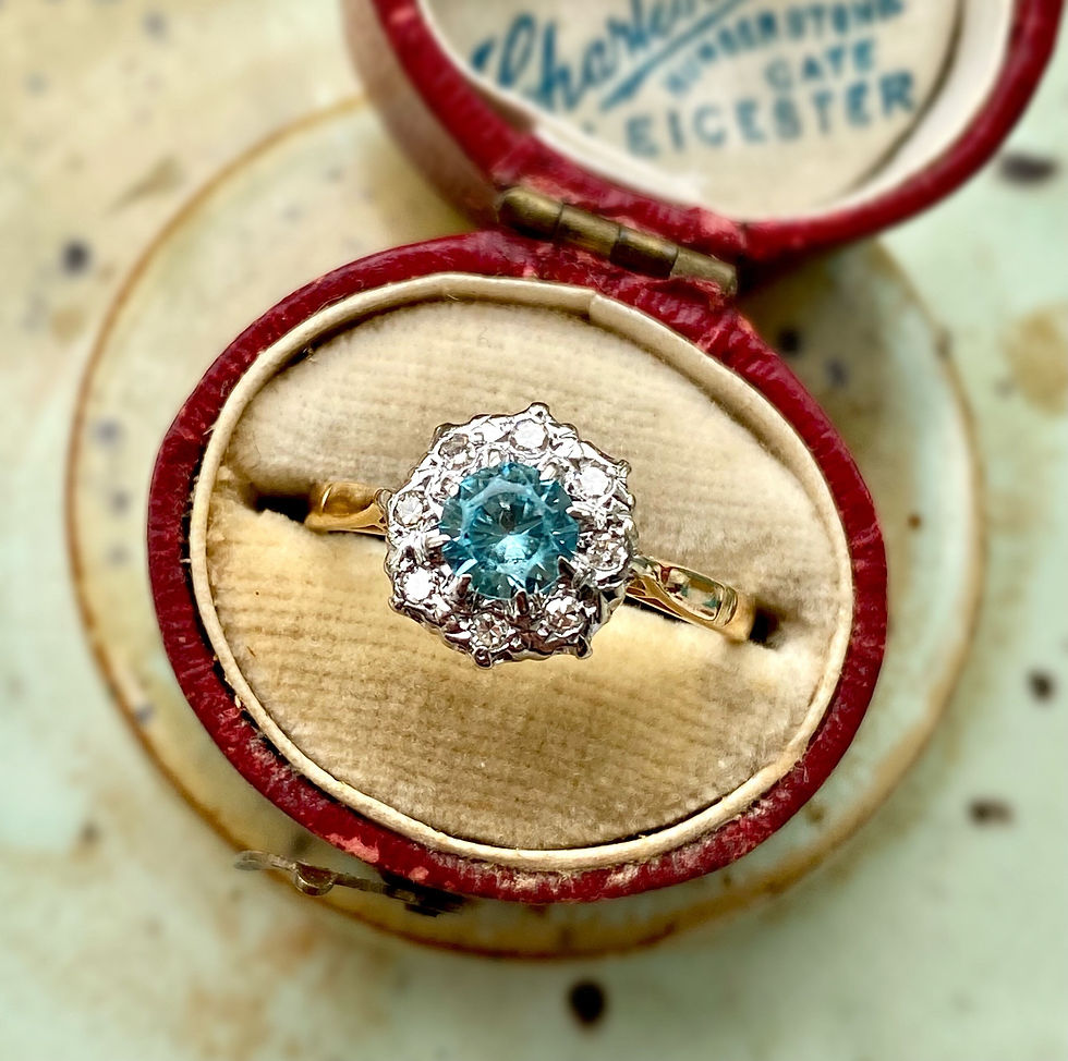 Vintage 18ct Gold and Platinum Blue Zircon and Diamond Cluster Ring